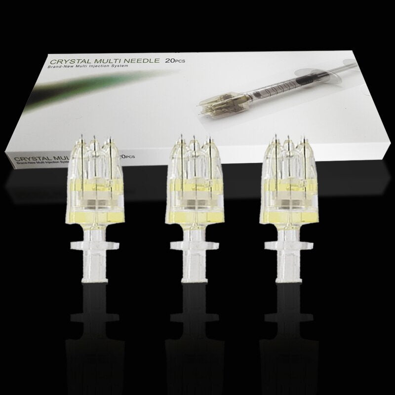 Múltipla 5 agulhas que se adapta ao tamanho universal da seringa. Pode ser usado para injeção manual ou pode ser usado com injetor de cristal ou hycoox para injeção sem sucção. Devido ao comprimento fixo da agulha e à ponta com design especial, a injeção não será dolorosa para o cliente. e não é provável que cause vazamento do produto.